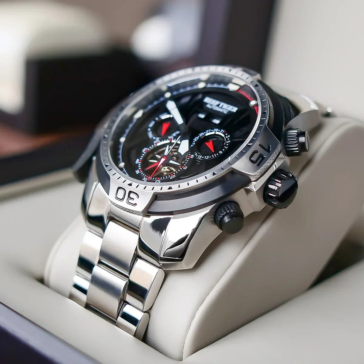 Discover sophistication with the Reef Tiger RGA3532-YBYO men's automatic sports watch. Crafted with precision and elegance, this timepiece boasts a stainless steel bracelet and a complicated dial design.