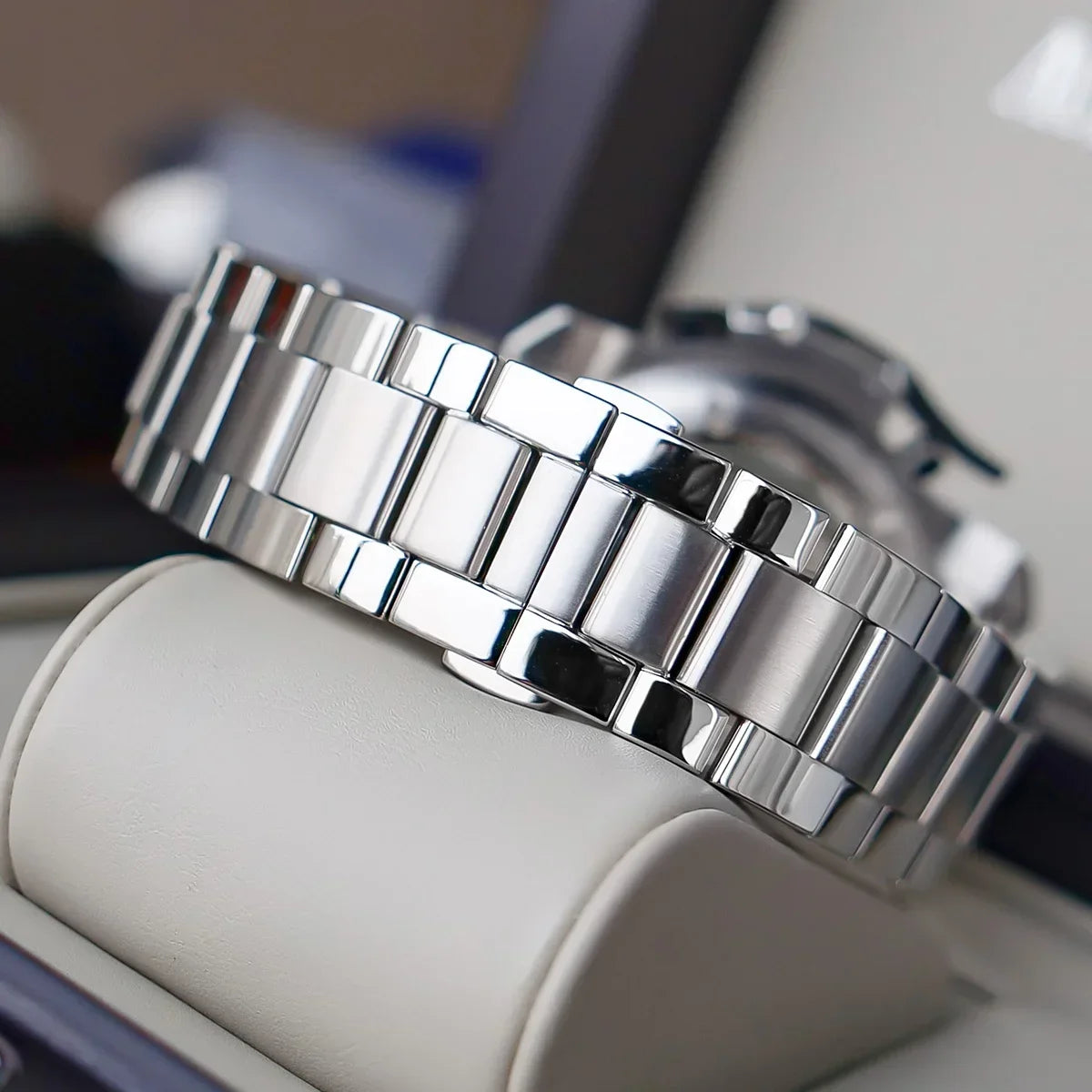 Constructed with a durable stainless steel case and sapphire crystal dial window, this watch is built to withstand the rigours of everyday wear. With a water resistance depth of 10 bar, it's suitable for various water activities, including surfing.