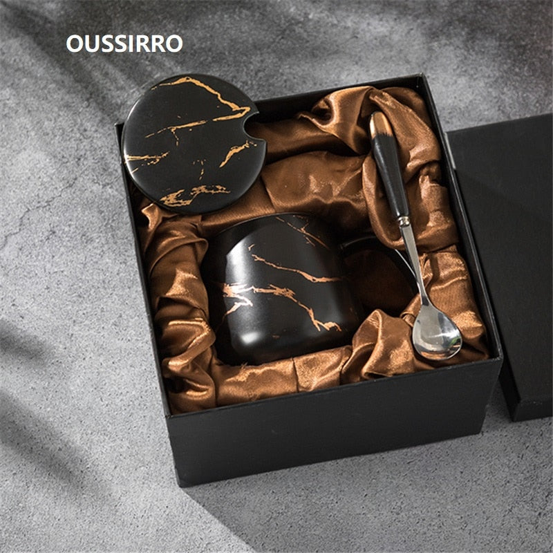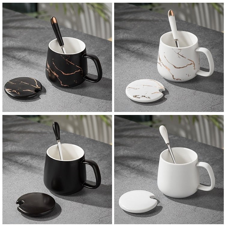 Marble Couple Cup 420ML. Ceramic coffee mug with spoon.